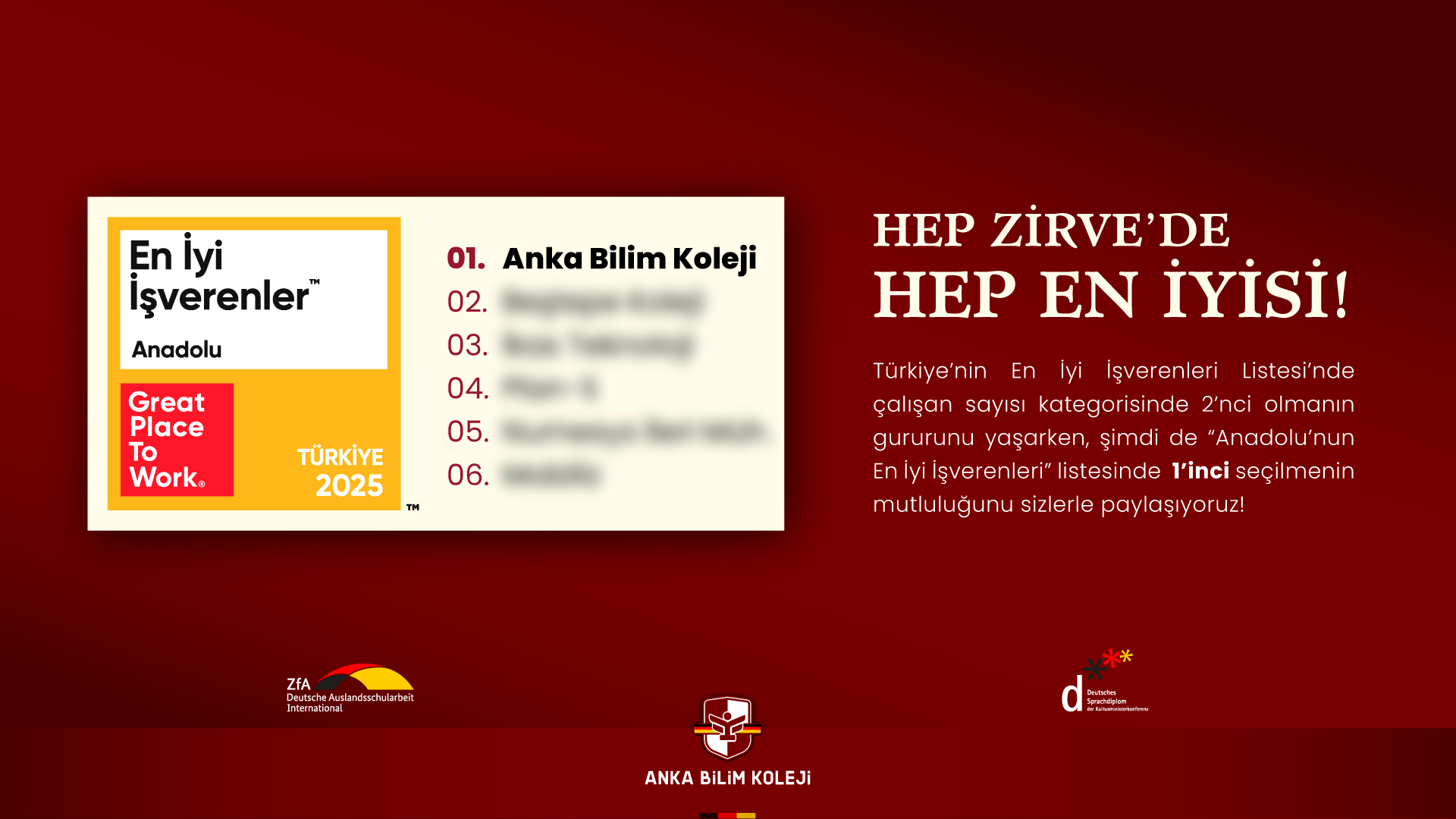 Türkiye’nin En İyi İşverenleri Listesi’nde çalışan sayısı kategorisinde 2’nci olmanın gururunu yaşarken, şimdi de “Anadolu’nun En İyi İşverenleri” listesinde 1’inci seçilmenin mutluluğunu sizlerle paylaşıyoruz!